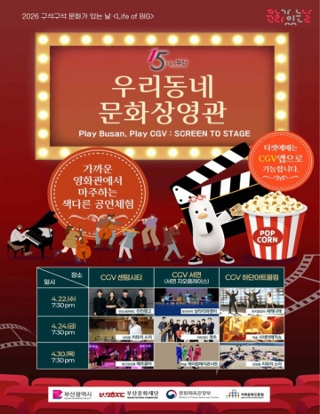 부산시(시장 박형준)는 문화체육관광부 공모사업 선정에 따른 "2026 '구석구석' 문화가 있는 날"의 일환으로, 씨지브이(CGV) 영화관과 협업해 시민들이 일상에서 문화를 더 가까이 즐길 수 있도록 「우리동네 문화상영관」 행사를 개최한다고 4월 15일(수) 밝혔다.