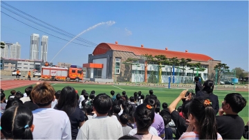 대피 이후에는 소방대원의 지도 아래 화재 발생 시 행동 요령과 대피 시 유의사항에 대한 교육이 이어졌다. 특히 소방차를 활용한 물 방사 시연을 통해 화재 진압 과정을 현장에서 직접 확인하며 안전의 중요성을 체감하는 시간을 가졌다.