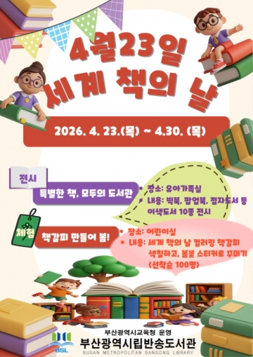 부산광역시립반송도서관(관장 박미양)은 세계 책의 날(4월 23일)을 맞아 오는 23일부터 30일까지 도서관 어린이실에서 유아와 초등학생을 대상으로 독서 문화 프로그램을 운영한다고 4월 21일 밝혔다.
