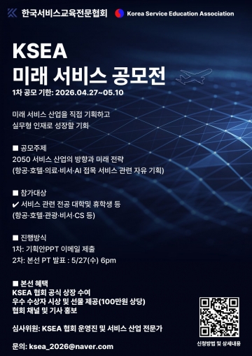 미래 서비스 산업을 이끌 인재를 찾기 위한 의미 있는 도전의 장이 열린다. 한국서비스교육전문협회(KSEA)는 4월 27일(월)부터 전국 서비스 전공 대학생을 대상으로 ‘2050 서비스 산업의 방향과 미래 전략’을 주제로 한 공모전을 공식 개최한다고 밝혔다.