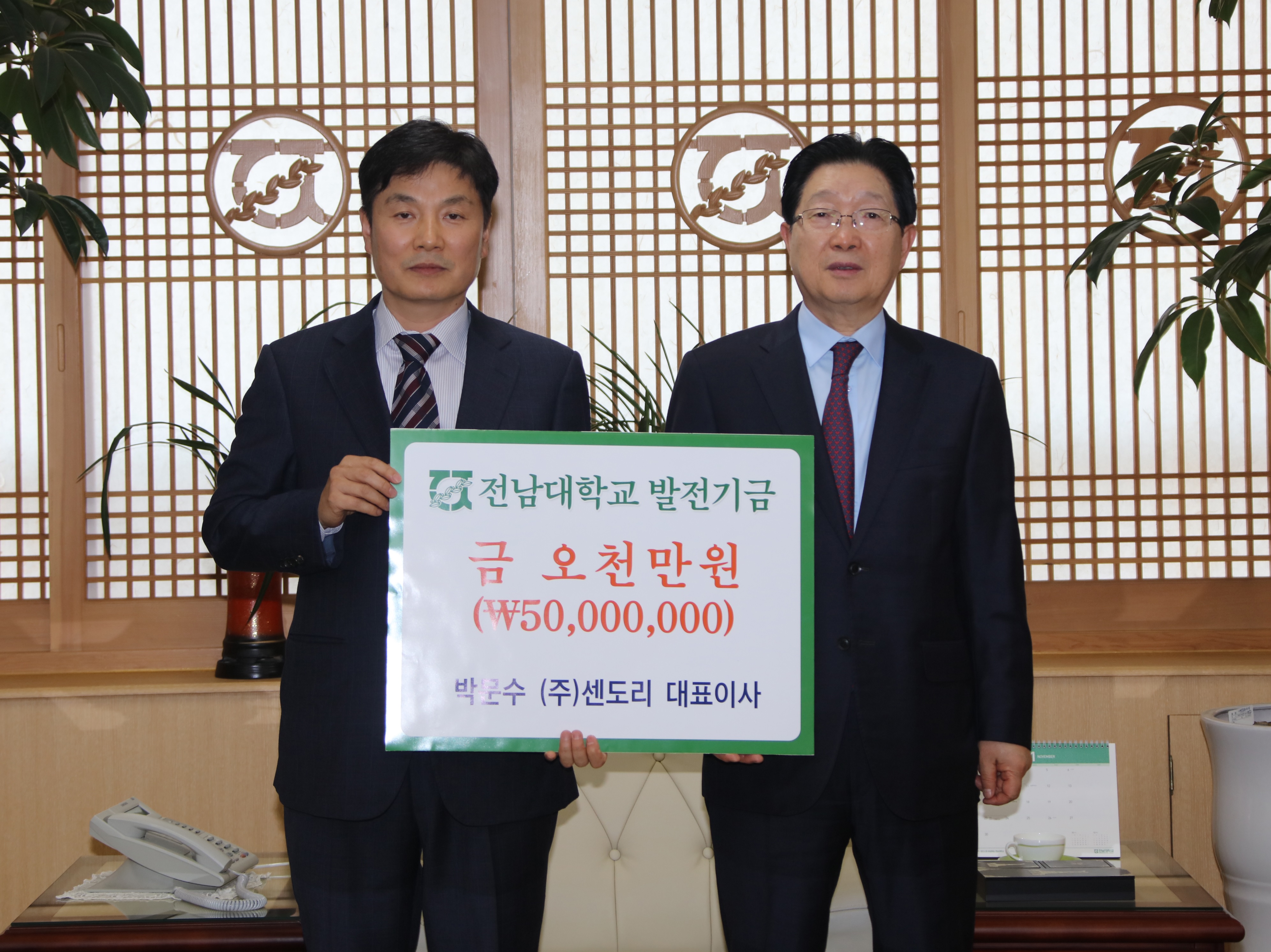 ㈜센도리 박문수 대표이사(49)는 11월 17일(화) 오후 전남대학교 대학본부 5층 총장실에서 지병문 총장에게 발전기금 5천만원을 전달했다.