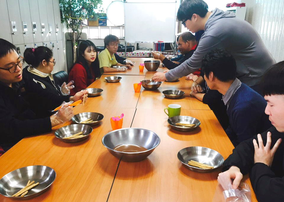 학생들은 이날 ‘빼빼로 데이’를 기념해 장애인들과 함께 막대 초콜릿을 만들어 보는 시간을 가졌다.