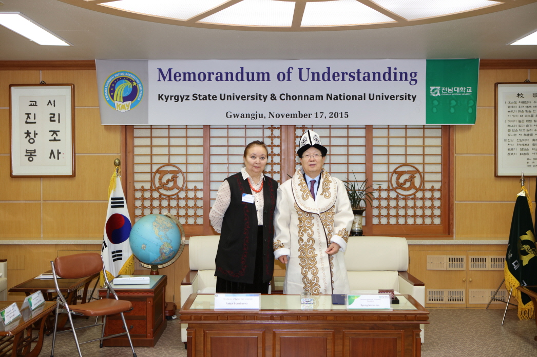 전남대학교는 11월 17일(화) 오후 대학본부 5층 접견실에서 키르키즈스탄 공화국의 키르키즈 국립대학(Kyrgyz State University)과 교류 · 협력을 위한 양해각서(MOU)를 체결했다. 이날 MOU 체결식에는 전남대학교 지병문 총장과 키르키즈 국립대학 아니사 보루바에바(Anisa Borubaeva) 부총장이 참석해 협정서에 서명했다.