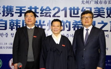 사진설명 : 호남대학교의 자매대학인 중국 장사시 후난대학에서 18일 한국인 최초로 중국교육부의 승인을 받은 객좌교수로 위촉된 윤장현 광주시장(중앙)이 박상철 호남대 부총장(오른쪽), 쟈오웨이 후난대 총장(왼쪽)과 기념촬영을 했다.