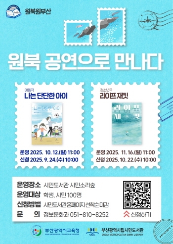 부산광역시립시민도서관(관장 이은경)은 오는 10월 12일과 11월 16일 오전 11시에 시민도서관 시민소리숲에서 어린이와 청소년 100명을 대상으로 ‘원북 공연으로 만나다’ 공연을 펼친다.