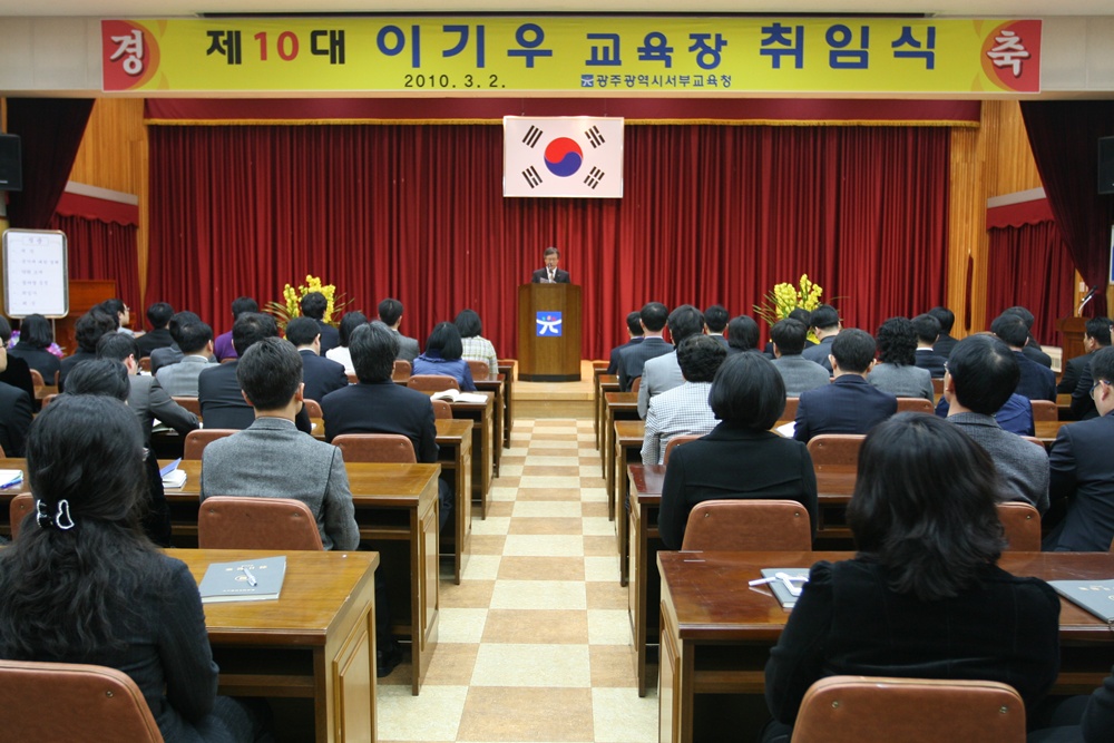 광주광역시서부교육청은 3월 2일 제10대 이기우 교육장의 취임식을 갖고, 학생 중심 서부 교육의 질적 도약을 위한 힘찬 출발을 하였다.