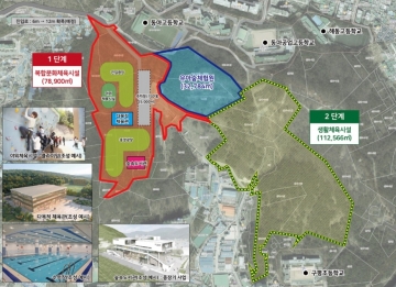 ▲1단계 (기존 군시설 산재 부지 중심) : 다목적체육관, 야외체육시설, 주차장, 광장 등 복합문화체육시설 우선 조성