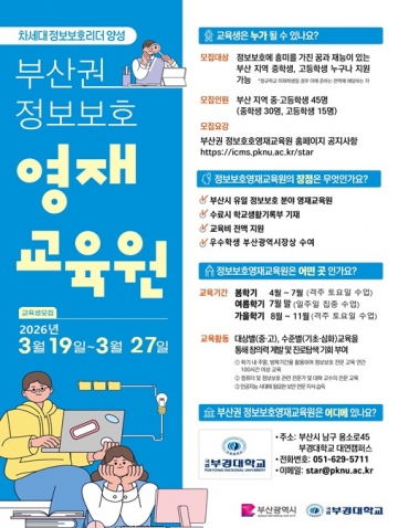 부산시(시장 박형준)는 정보보호 분야에 관심 있는 부산 지역 중․고등학생을 대상으로 오는 3월 19일부터 3월 27일까지 '2026년도 부산권 정보보호영재교육원'의 신입생을 모집한다고 3월 10일 밝혔다.